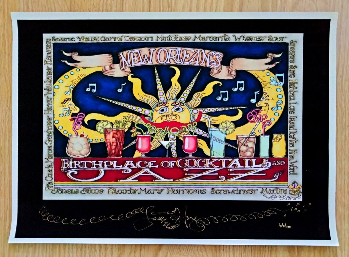 Birthplace of Cocktails and Jazz is one of Jamie’s most popular designs. This version is a black background giclee, only 100 were printed.It is signed and numbered in gold metallic pen, it measures 12 x 16 inches.
