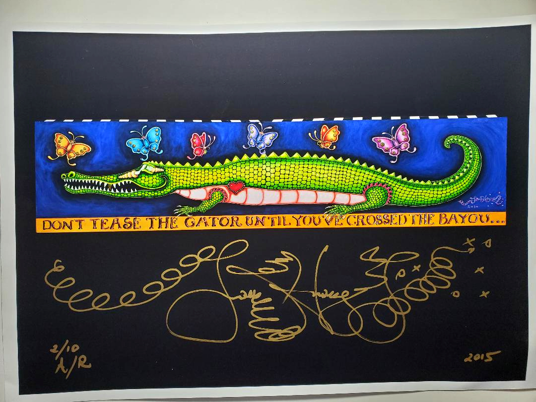 This black background giclee is remarqued by Jamie using gold and silver foil. He signed it in gold metallic pen. This piece is number 2/10 and measures 12 x 16 in.