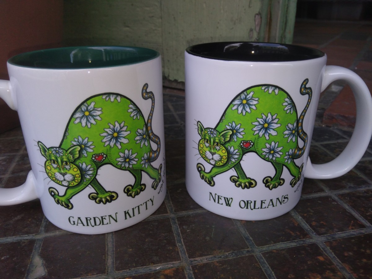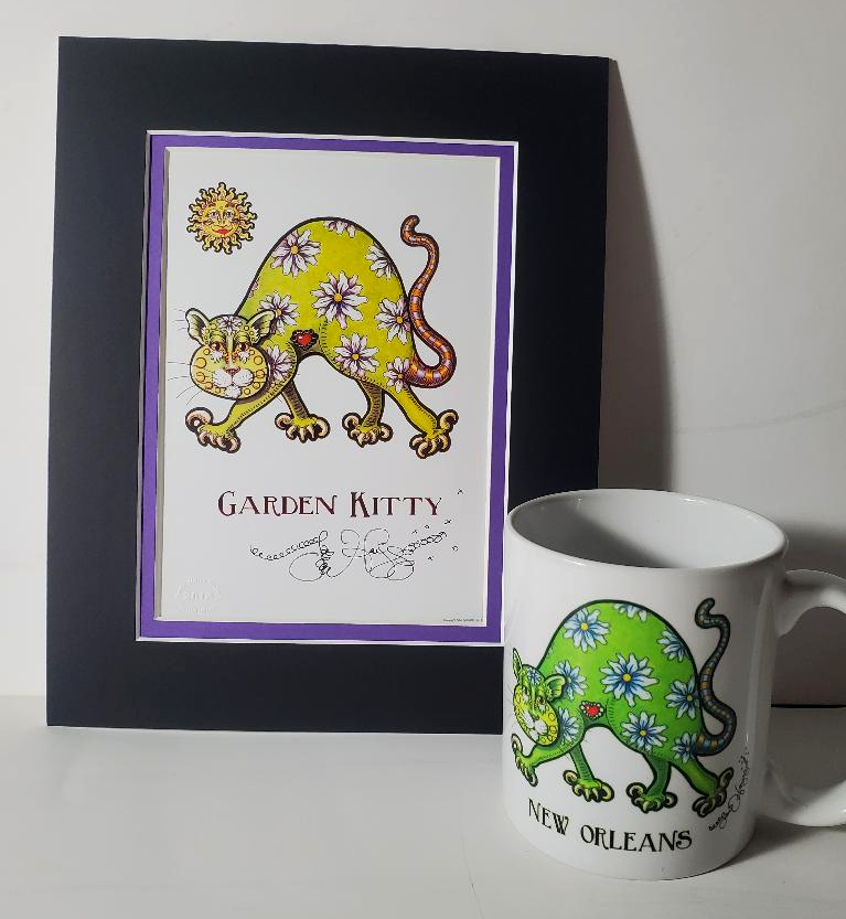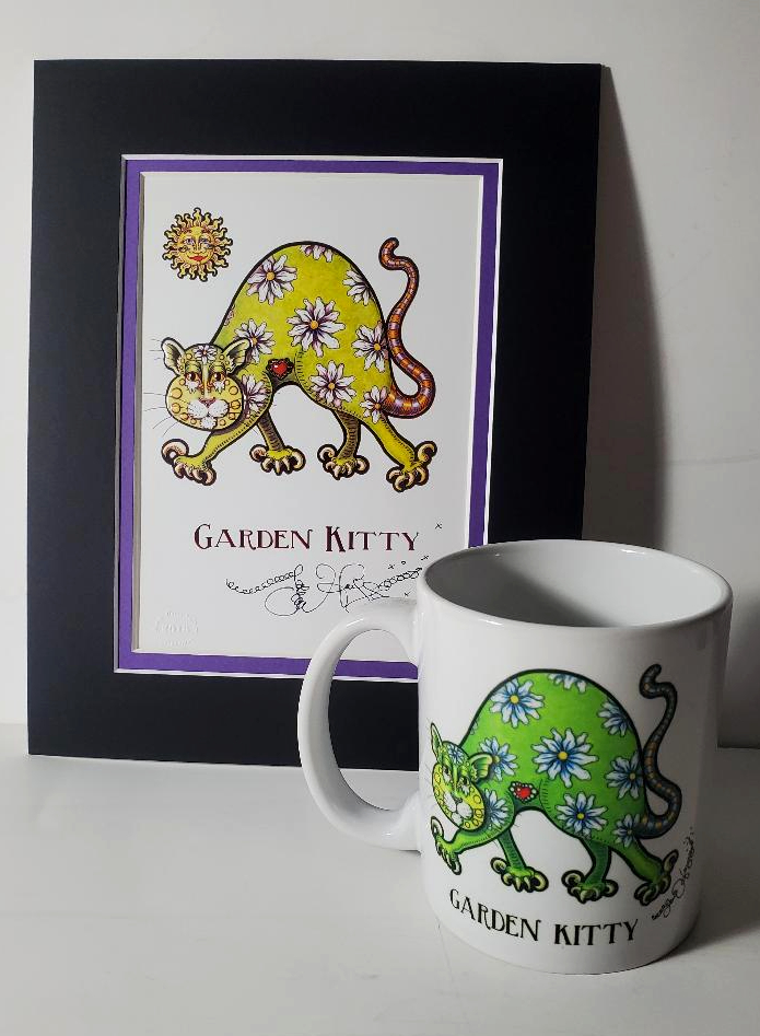 This gold embossed Garden Kitty print is signed and matted to fit an 8 x 10 frame. The Garden Kitty mug is printed on both sides. Also included is a super cute gift box for the mug.