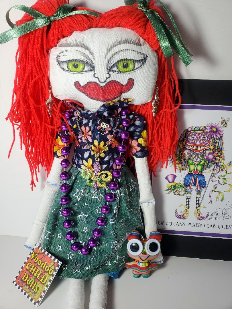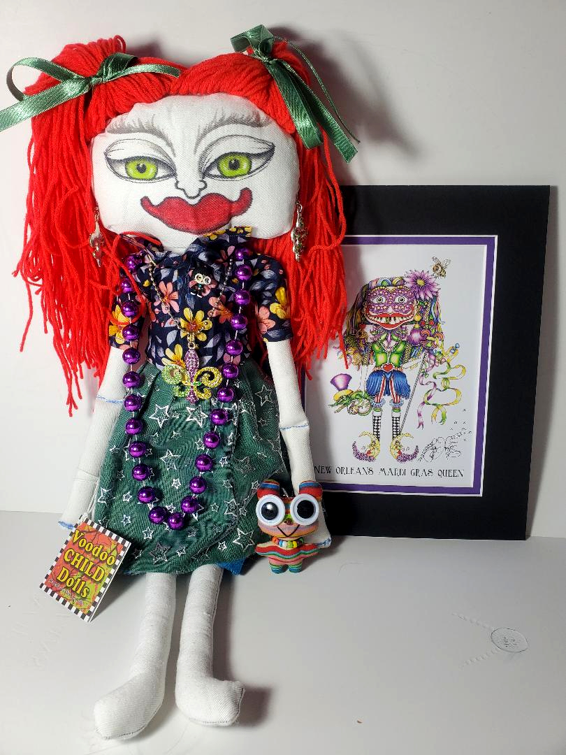 Each 18 inch doll is completely unique. Hand painted by Jamie and signed on the back. They are adorned with buttons and jewelry that were for sale in the gallery on Chartres St. This doll is looking for an extra special home! FREE Jamie Hayes signed Voodoo Dolls print and stuffed keychain
