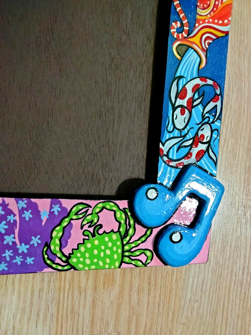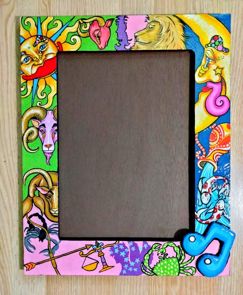 Only a few of these hand painted wood frames were made, this one has an astrology theme. The frame measures 16 x 20 inches on the outside and the window is 11 x 15 inches. The music note on the bottom right is 3-D. This is a very cool one of a kind piece.