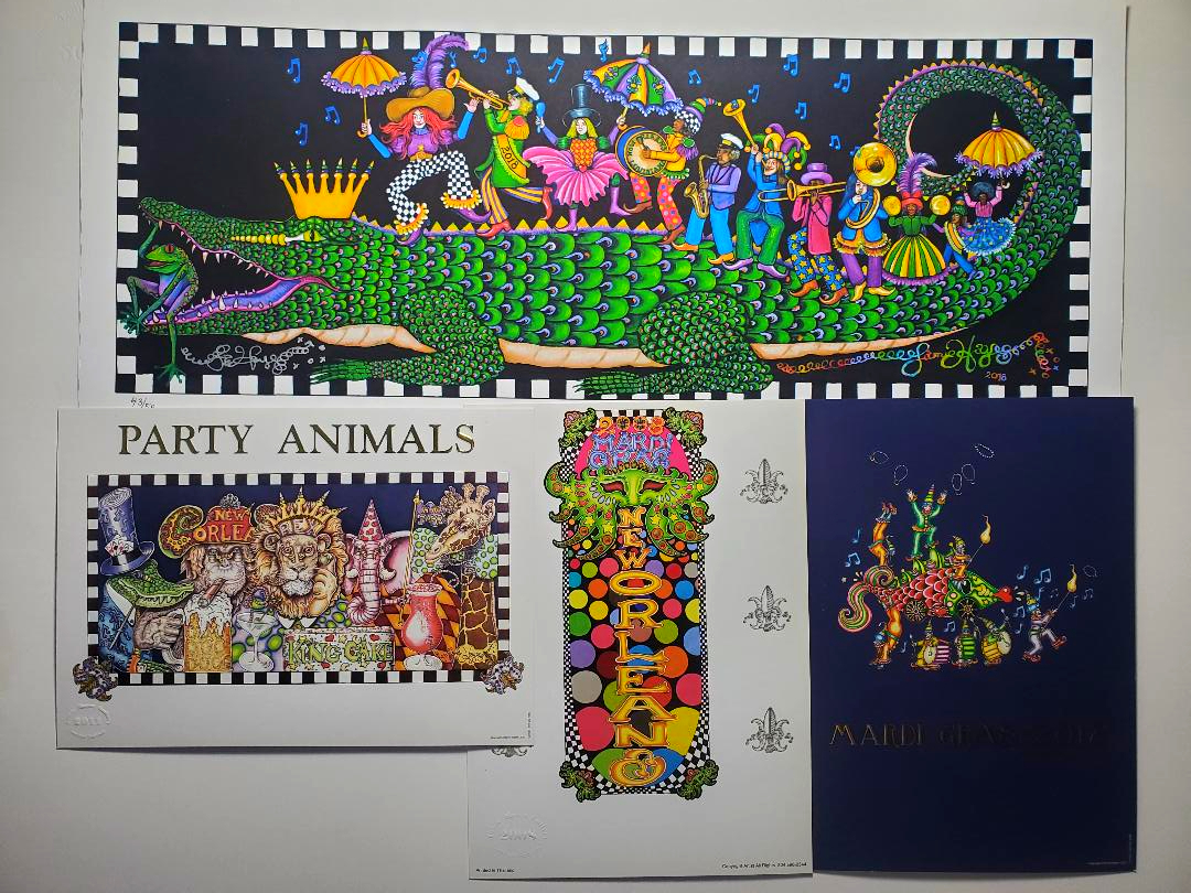King Gator and his 2nd Line was Jamie’s Mardi Gras design in 2018, New Orleans 300th Anniversary. This giclee is signed and measures 6.5 x 15.5 inches. Also included is a set of 3 Mardi Gras prints, 5 x 7 inches. This giclee was printed on acid free paper in Jamie’s studio in New Orleans.