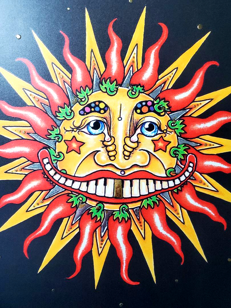This Chili Pepper Sun is one of Jamie`s most popular designs. This special piece measures 11.5 x 13 inches and has been hand signed by Jamie in gold metallic pen. This very special piece has been extensively remarqued with gold and silver foil.