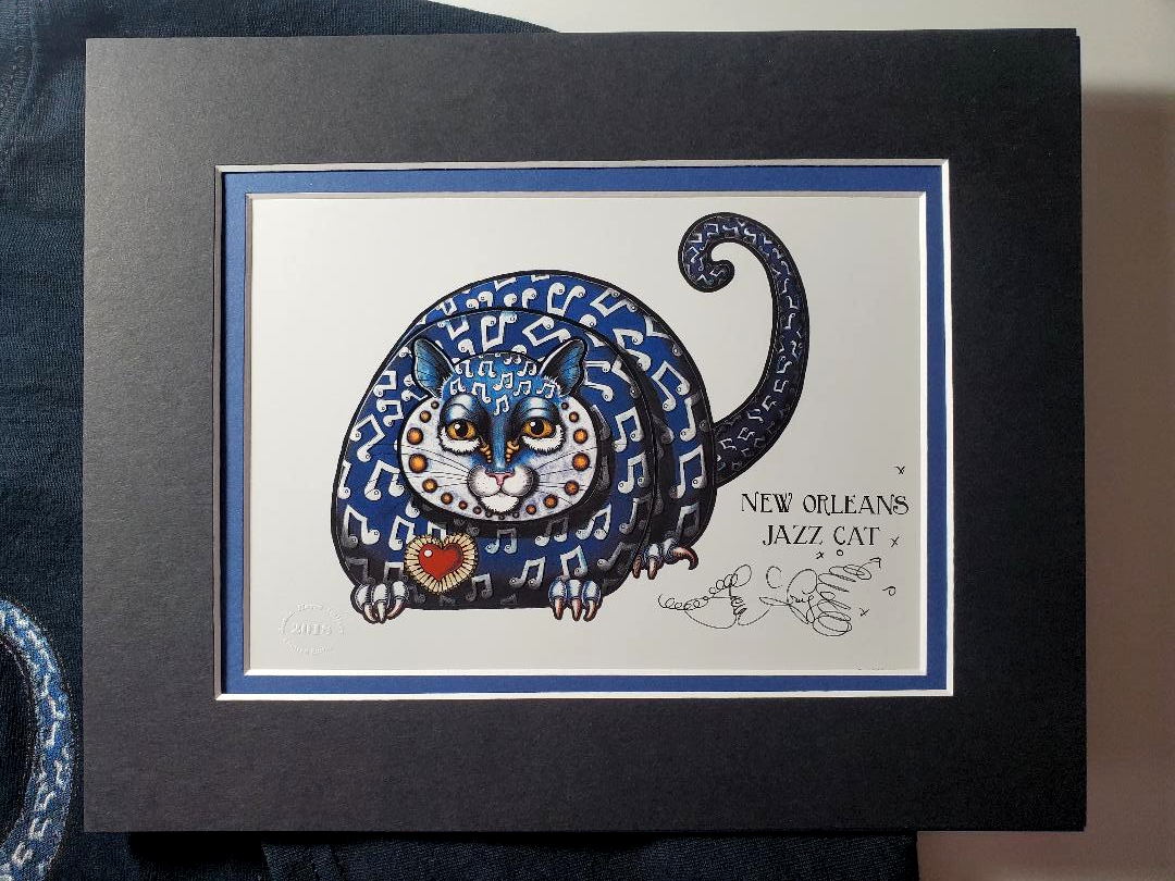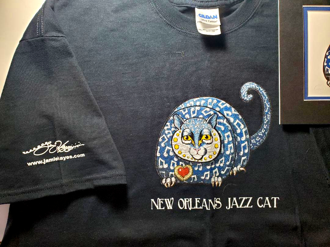 This black 2XL Jazz Cat T-Shirt is 100% cotton and was printed in New Orleans. Included in the set is a signed New Orleans Jazz Cat print matted to an 8 x 10.