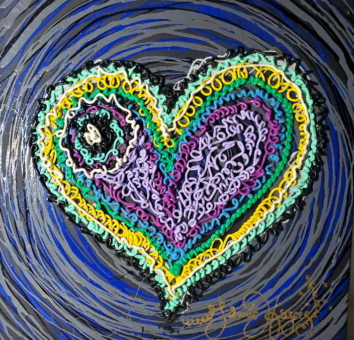 Jamie used oil paint in syringes and squirt it on the canvas to achieve the effect in this painting. He always compared it to cake decorating. This painting is 13 inches square and is signed by Jamie.