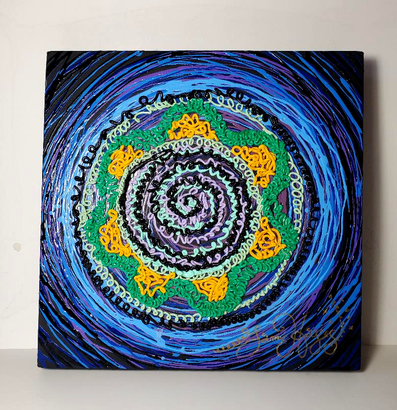 Jamie used oil paint in syringes and squirt it on the canvas to achieve the effect in this painting. He always compared it to cake decorating. This painting is 13 inches square and is signed by Jamie.