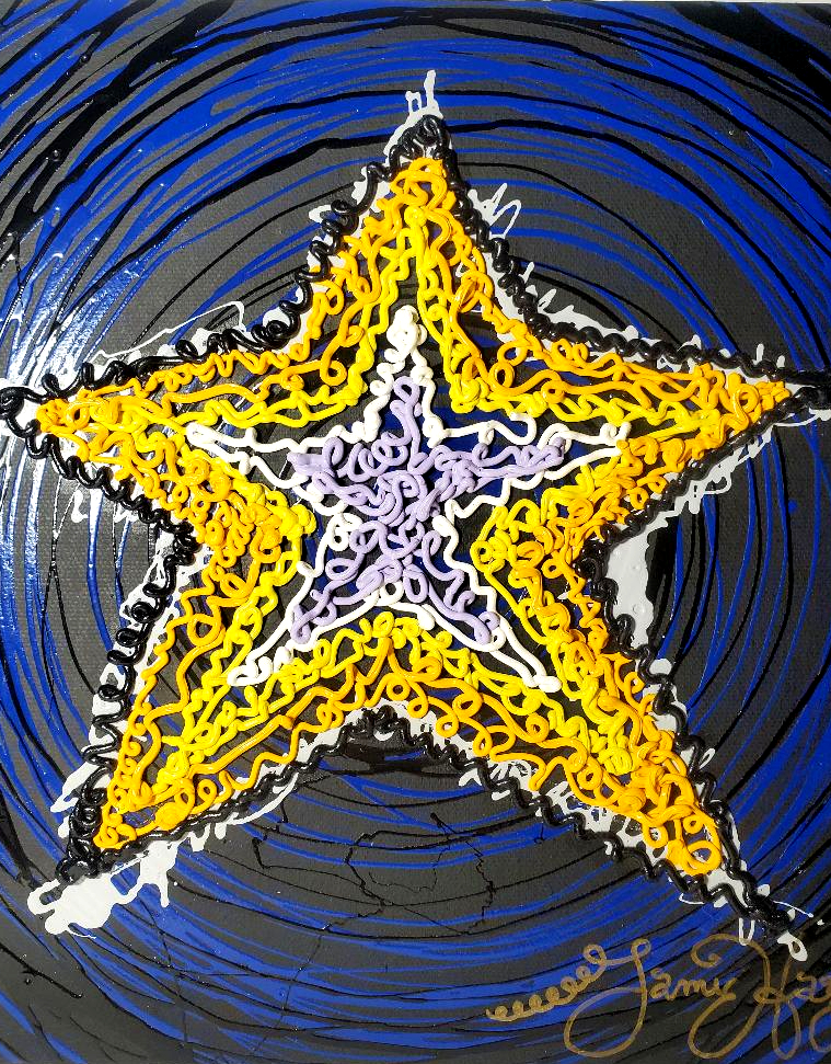 Jamie used oil paint in syringes and squirt it on the canvas to achieve the effect in this painting. He always compared it to cake decorating. This painting is 13 inches square and is signed by Jamie.