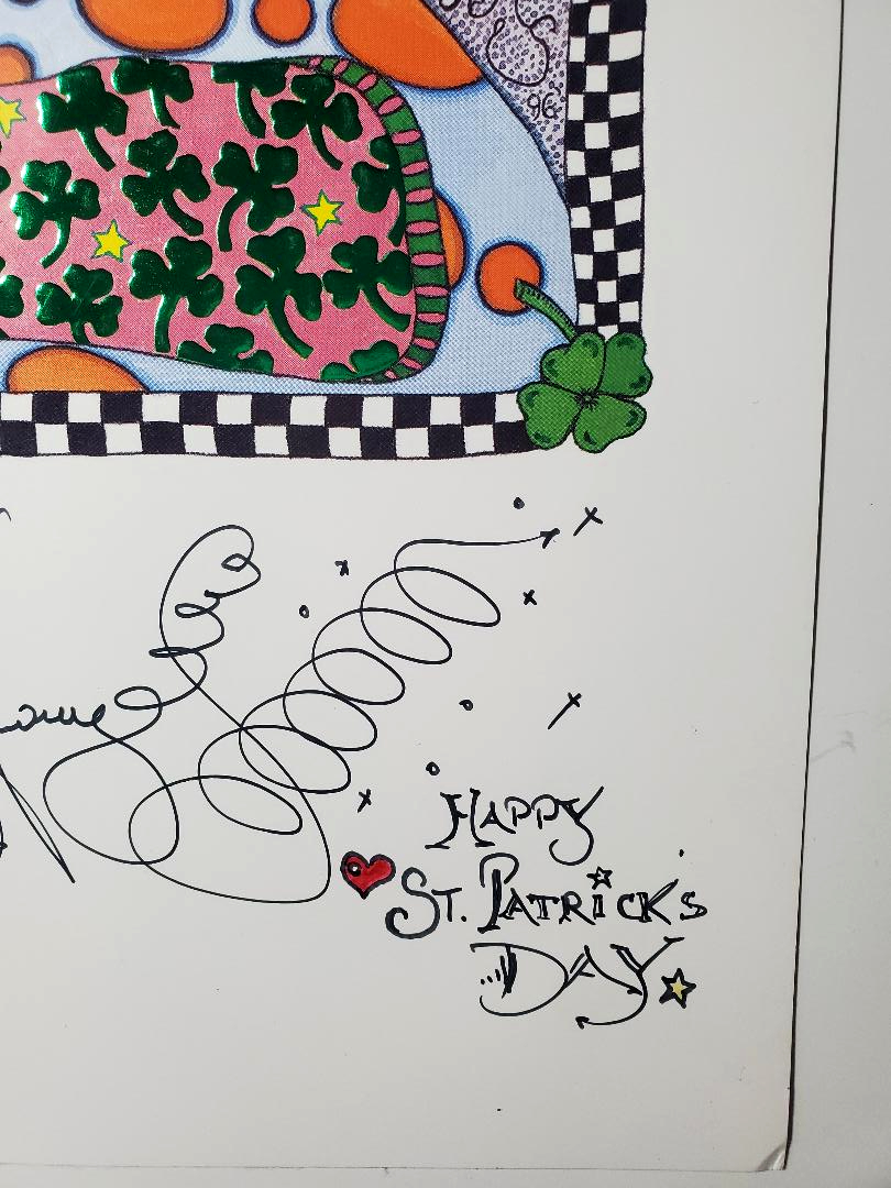 Jamie added “Happy St. Patrick’s Day” to this print making it a one of a kind. The shamrocks in “Happy St. Patrick’s Day” are embossed in green foil. This is also an illustration from Jamie’s first children’s book “The Legendary Adventures of the Flying Mingling Brothers.” This print comes signed and measures 11″ x 14″.