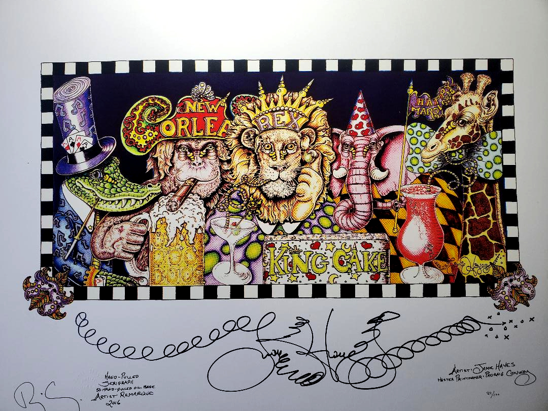 “Party Animals” was Jamie’s Mardi Gras design in 2004 and also his most popular. This 50 color, hand pulled serigraph is printed on heavyweight 50% linen paper. The printing of this serigraph took over 2 months to make. Each screen was hand cut and each color had to dry before the next color was applied. Size: 20 x 26 inches. It is not only signed by Jamie, but also the print maker Padraig Conway.