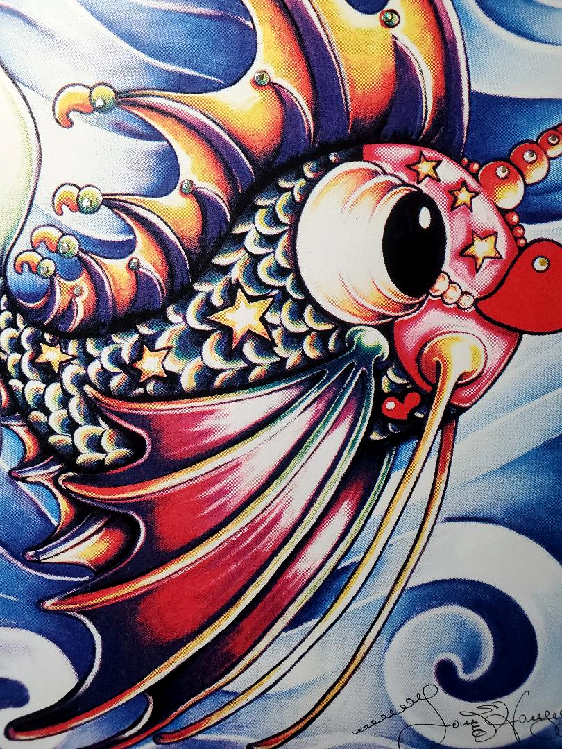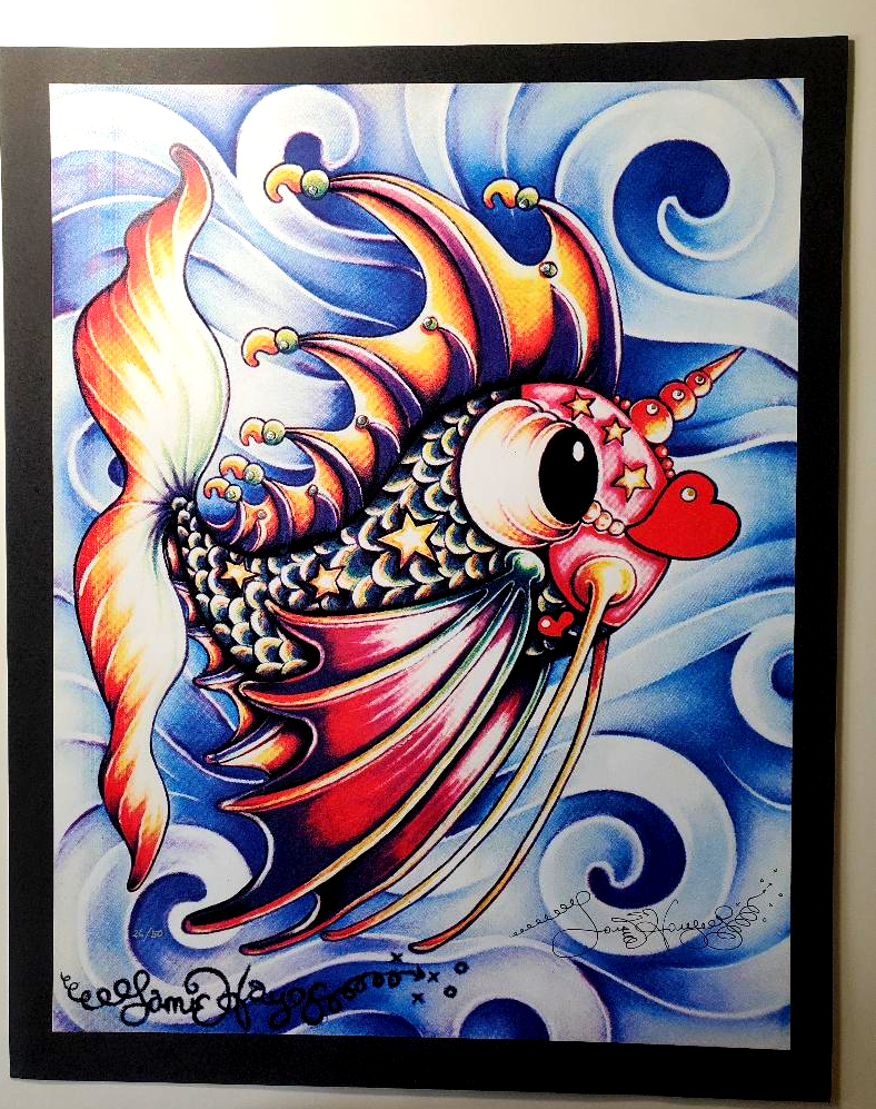 Jamie remarqued the fish in green, silver and gold foil. This hand pulled serigraph is printed on 50% linen paper. It was printed in 2003 and measures 18.5 x 23 inches. With the advent of giclee prints few people print hand pulled serigraphs, this is a very special piece. This one is #26/50
