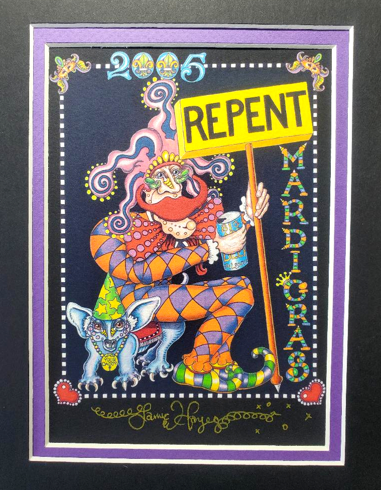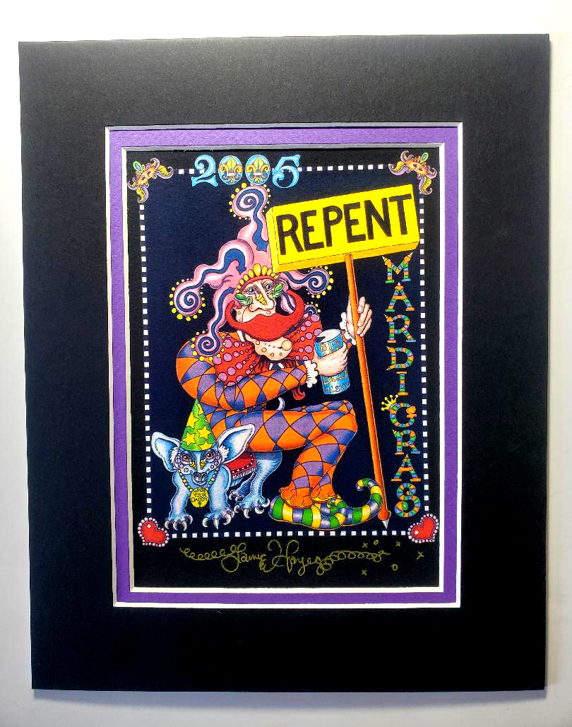 “Repent” was Jamie’s design for Mardi Gras 2005. This black background giclee is printed on acid free paper and signed in liquid gold pen, it its matted to an 8″ x 10″. If you asked Jamie what his favorite Mardi Gras design was he would have answered “Repent.”